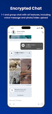 e. Secure encrypted 1-1 chat, group chat, and real-time audio/video calling with full-screen incoming call notifications.